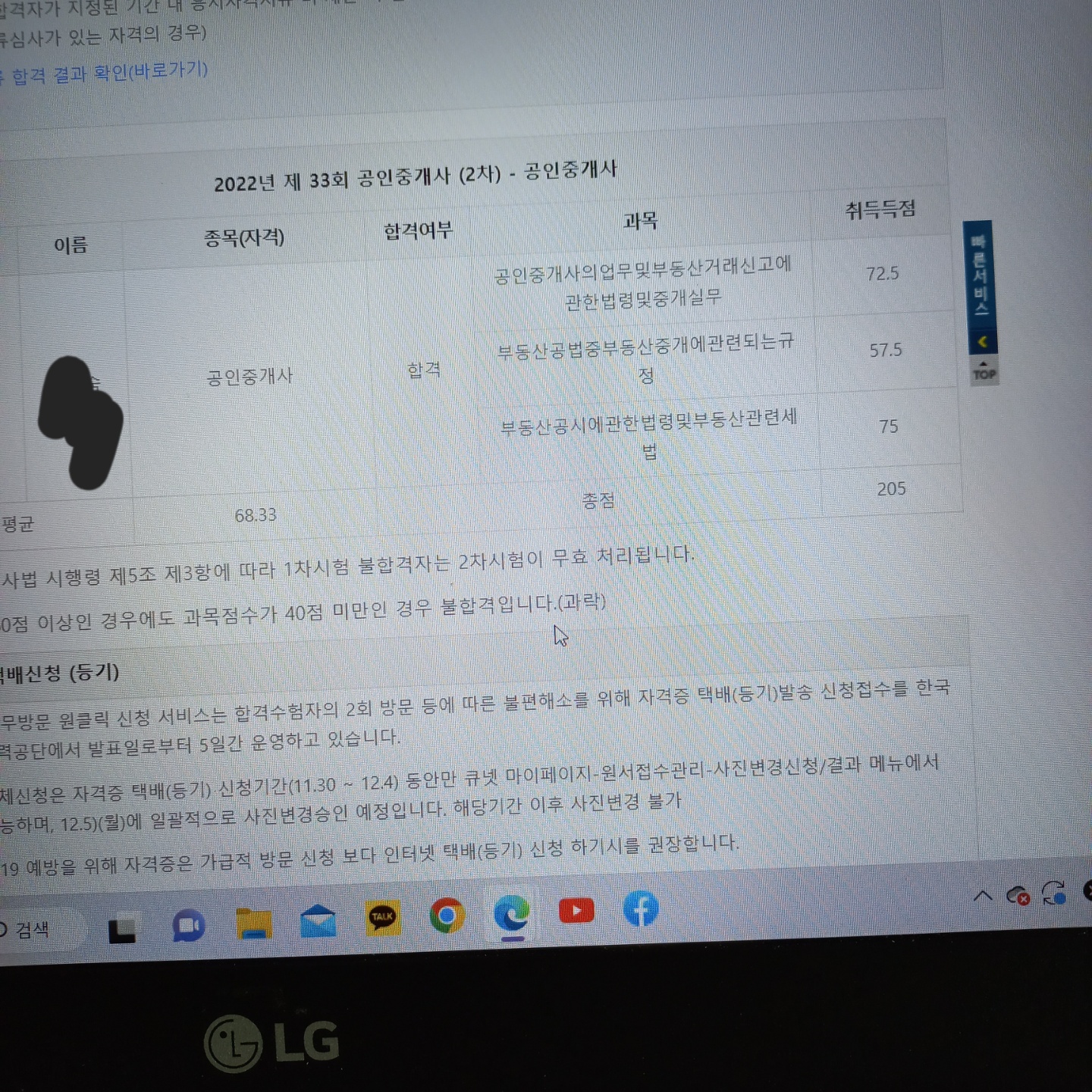 6시부터 정답이 공고된다고 했는데 난 가채점을 할 수가 없었다. 너무 무서웠다. 공법은 왠지 과락인거 같았다. 무서운 마음에 채점을 미루고 미루다 가채점을 하기 시작했다. 중개사법은 72.5, 공법은 58.5, 공시법은 72.5로 나왔다. 마킹하는데 큰 실수만 하지 않는다면 난 합격이다. 하늘을 날아갈 것 같았다. 그동안의 고생이 보상받는 기분이었다. 거의 10개월을 공인중개사 2차 시험에 매달렸다. 이게 이럴만한 가치가 있는 자격증인가를 계속 되뇌어보면서 공부를 했다. 아무래도 자신이 없고, 투자한 시간에 비해 가치가 있을지도 미지수였다. 하지만 난 쉬지 않고 공부했다. 핵심은 그거였다. 쉬지 않고 공부한다는 거. 의심이 되고 불안하기도 하고 자신도 없었지만 쉬지 않고 공부를 해나가는 것이었다. 필요없을 것 같다고 속단하고 포기하는 것이 아니라 끊임없이 의심하면서도 공부는 계속 했다. 결과는 합격이다. 이 자격증이 어떤 용도로 쓰일지는 아무도 모른다. 하지만 난 준비한다. 기회는 준비하는 자에게 온다.