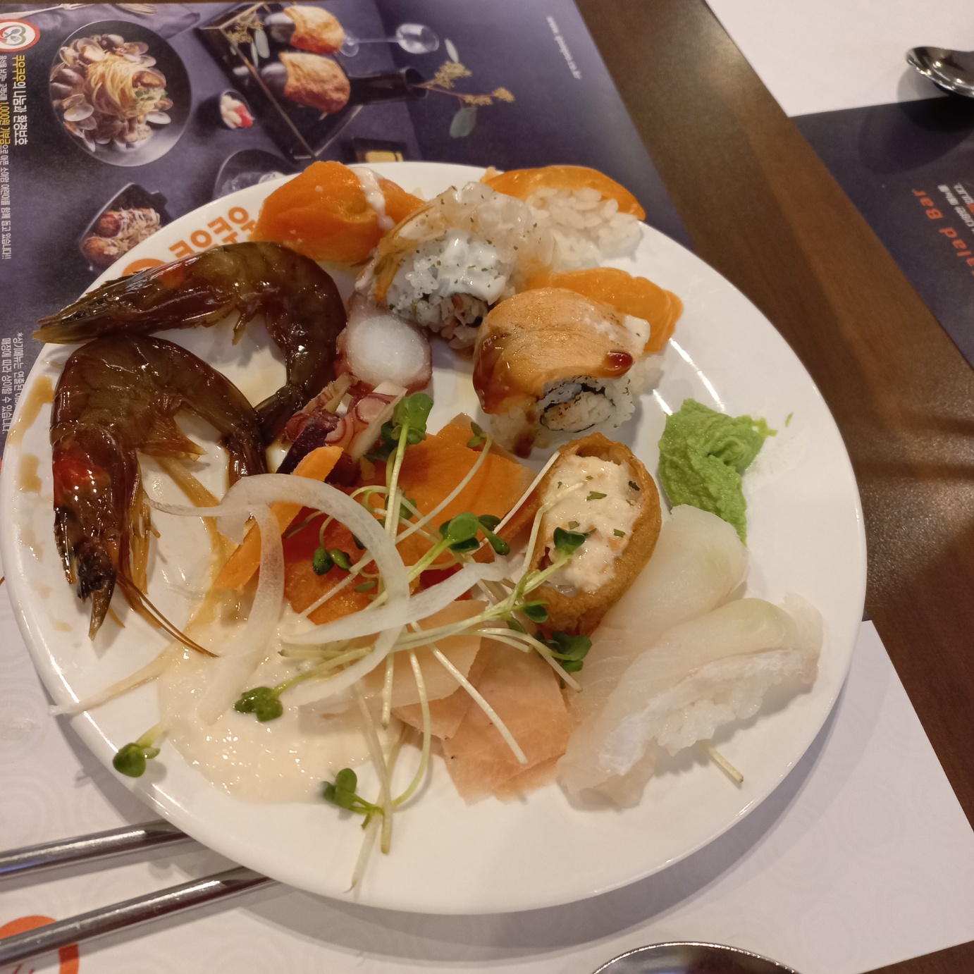 호텔 뷔페를 여러번 갔지만 그때도 사실은 회사에서 비용을 부담할 때였으니망정이니 내 지갑을 열고 가기에는 상당히 부담스러운 가격이다. 나같은 서민이 외식하기에는 쿠우쿠우만한 곳이 없다. 일단 초밥과 새우를 실컷 먹을 수 있기 때문이다. 스시, 군함, 캘리포니아롤이 종류별로 구성되어 있고, 일반 뷔페에서 볼 법한 기본적인 음식들은 다 구성되어 있다. 특히 쿠우쿠우는 새우 종류가 많다. 새우튀김, 새우 구이, 간장 새우, 새우 초밥, 새우 깐풍기등 새우를 실컷 먹을 수 있도록 구성되어 있다.