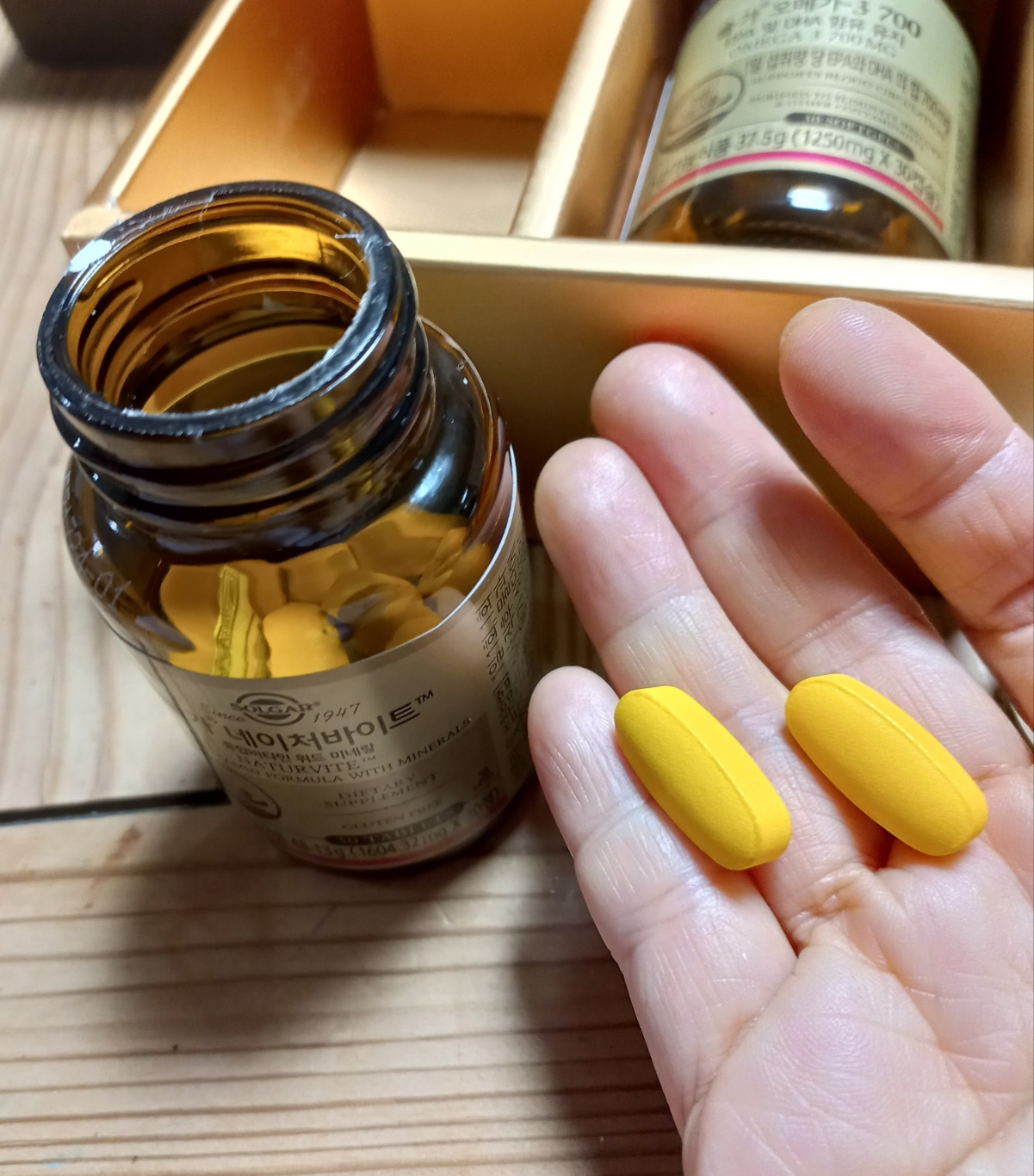 아무튼 선물은 선물이니 감사히 먹는 중이다. 솔가 제품은 이미 철분제를 여러개째 먹는 중이라 익숙한 브랜드이다. 네이처바이트와 오메가-3는 이 제품으로는 처음이다. 네이처 바이트를 받자마자 2알 먹어 봤다. 일반 비타민은 먹으면 소변이 그날 하루만 노랗게 변하는데 이 제품은 이틀동안 변화가 있었다. 2알 먹고 몸에 특별한 활력이나 체력에 변화가 일어난 것은 없다. 일단 평소 육식과 탄수화물 위주의 식단이다보니 비타민과 미네랄이 부족할 듯 싶어서 챙겨서 먹는 편이다. 우리 몸에 필요한 비타민과 미네랄은 음식으로는 부족하다고 하니 몸이 좀 찌뿌둥하다 싶으면 먹는 편이다. '비타민의 역습'을 보면 비타민제를 먹는 것이 독을 먹는 것과 같다는 내용이 나온다. 비타민을 먹으라는 것인지 먹지 말라는 것인지 의학 지식이 없는 나로서는 헷갈린다. 그래서 택한 방법이 먹기는 먹되, 열심히 먹지 않는다는 것이다. '이건 먹는 것도 아니고 안 먹는 것도 아니다.'