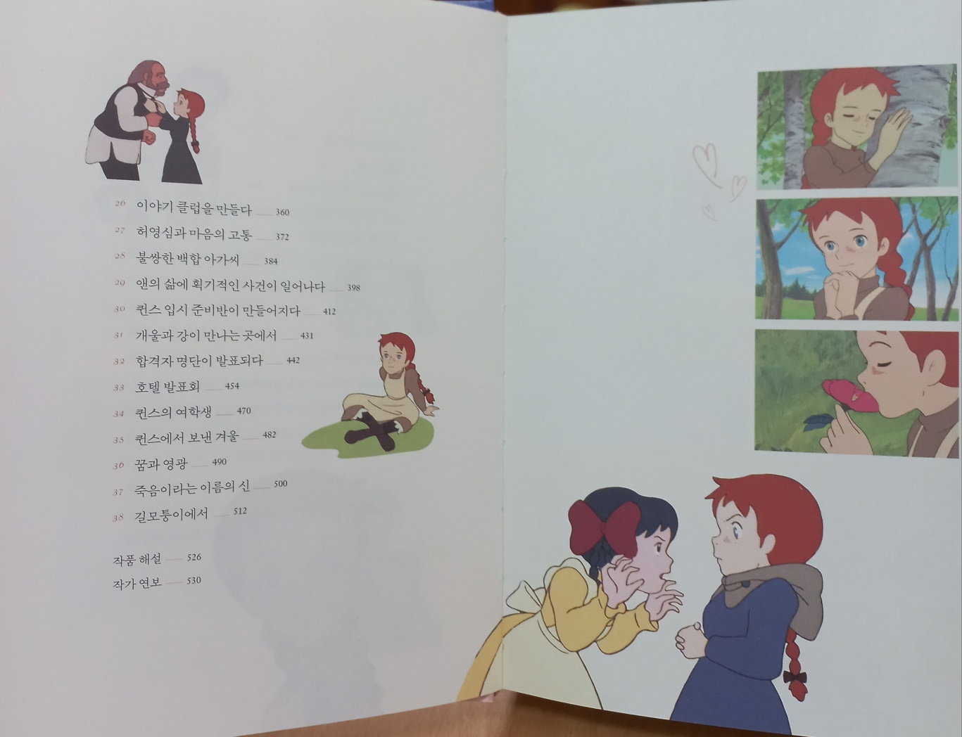 겉표지는 양장본으로 되어 있고, 책갈피용으로 빨간색 줄도 있다. 그리고 중간중간 애니메이션 그림이 삽입되어 있다. 많은 삽화로 어린 아이들도 부담없이 읽을 수 있겠구나 싶어서 구매했는데 왠걸... 글밥이 장난이 아니었다. 초등 고학년 이상은 되어야 인내심을 갖고 읽을 정도의 작은 글씨체였다. 원래는 아이들 읽게 할 용도였는데 당분간은 나 혼자 봐야겠다.
