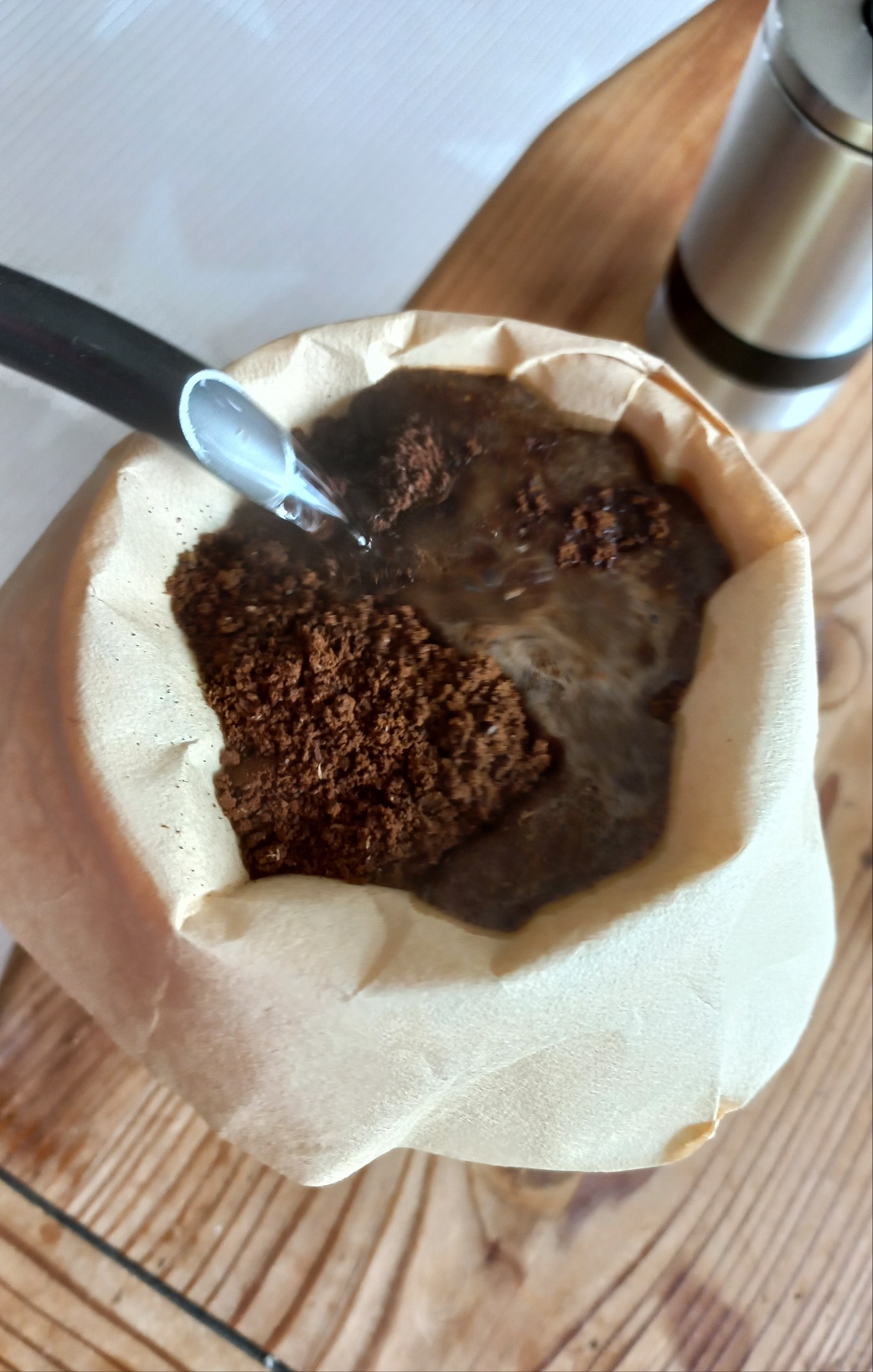 정말 핸드 그라인더는 한 잔만 갈아야 한다. 욕심부리고 두 잔 정도 갈다가는 약간 분노데시벨이 올라올지도 모른다. 겨우 한 잔 용량을 갈면서도 아~ 스타벅스에서 전동기계에 갈아오던게 편했구나 하는 생각을 하게 됐다. 생각보다 가는 동안 심심풀이나 소꼽놀이 기분은 덜했다. 그만큼 너무 소량씩 갈려나왔다는 뜻이다. 팔 운동한다는 개념으로 열심히 간다면 옳은 선택이다. 한잔 분량을 갈아서 급하게 물을 끓여서 필터에 내렸다.