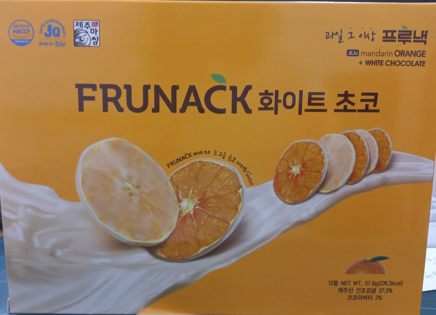 푸르넥 화이트 초코를 알게 되었다. 상큼한 과일을 슬라이스하여 화이트 초코로 코팅이 된 제품이다. 그냥 과일 모양이 나는 화이트 초코겠거니 하고 뜯었다. 하지만 한 입 베어 문 순간 아니었다. 상큼한 제주감귤향이 그대로 살아있었다. 자연 건조를 했는데도 이런 상큼함이 남아있다는게 신기할 정도였다. 프루넥초코 제품은 제주팜21의 독자적인 기술로 탄생한 천연건조과일 브랜드 프루넥 제주감귤에 화이트초코를 아주 얇게 발라 제주감귤 고유의 풍미와 달콤한 초코 맛을 함께 즐길 수 있는 새로운 차원의 고급 초코 디저트라고 쓰여 있다. 개당 4.8g(22.9 Kcal)으로 건조감귤(제주산)37.5%, 코코아버터 2%가 함유되어 있다.