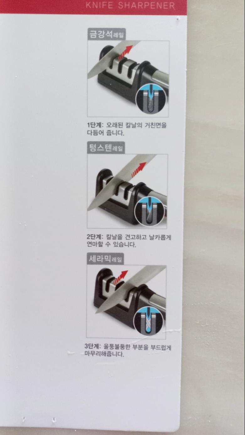 이것저것 검색한 끝에 그래도 나에게 가장 만만한 것은 다이소구나. 숯돌은 없고 몇개의 칼갈이 도구가 있었다. 다이소에서 가장 비싼 칼갈이를 무려 5천원이나 주고 샀다. 일반적으로 다이소 물건들은 가볍고 싸다. 하지만 칼갈이마저 싸고 가벼운걸로 살 수는 없었다. 나름 묵직해보이는 걸로 샀다. 포장되어 있어서 사용해볼 수도 없다. 그냥 들고 와서 성능을 확인해보기로 했다. 칼 가는 면은 3단계로 나뉘어져 있었다. 금강석, 텅스텐. 세라믹 순이다. 뒤로 갈수록 미세하게 갈리고 앞으로 갈수록 더 성글게 갈리는 구조였다. 뒷면에 나온 설명서 대로 밖에서 안쪽으로 한쪽 방향으로 연마해 주는 방법이었다. 원래 숯돌에 갈때도 한쪽 방향으로만 힘을 주면서 가는 거라고 들었다.