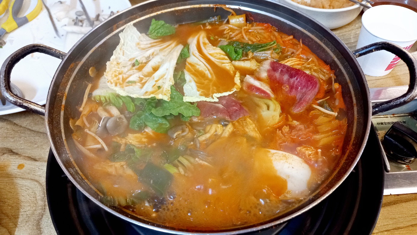 붉은 육수에 갖은 야채와 고기가 나왔다. 그리고 이 집 맛의 백미를 장식한 칼국수 면까지도. 손으로 반죽하고 밀어서 질척거리면서 모양이 흐트러진 모습이 누가봐도 손으로 만든 칼국수면이었다. 면은 쫄깃거렸고 아낌없이 퍼주는 버섯과 야채는 풍성했다. 그럼에도 나는 한없이 허기가 들었다. 먹어도 먹어도 헛헛함은 사라지지 않았다.