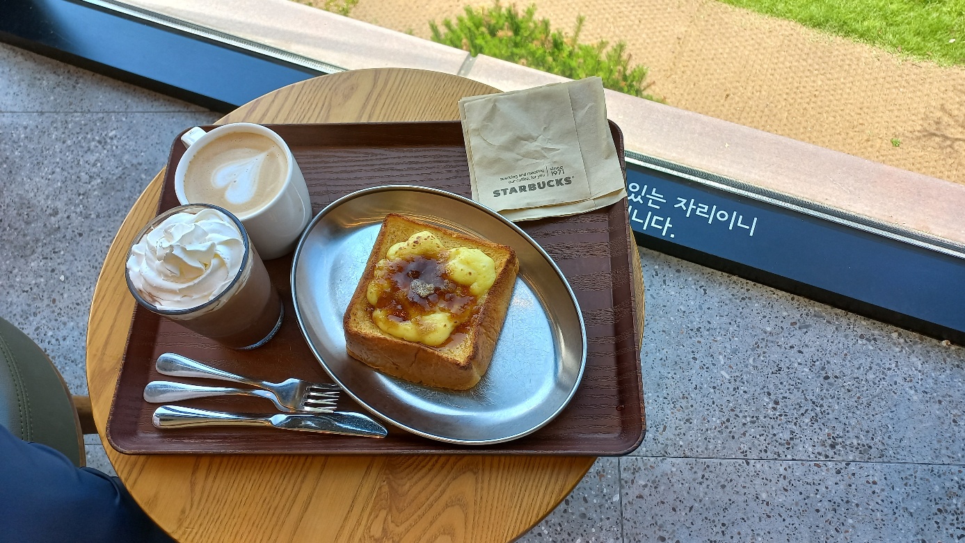한적한 외곽이라고 해서 카페에서 시간을 보내는 건 생각하기 어렵다. 이게 사람 마음이 이상한게 몇만원 몇십만원은 다른데다 써도 주차비에 나가는 돈은 버리는 돈이라는 생각에 오래 주차를 안하게 된다. 그런 심리를 이용한 탓인지 자리 회전이 굉장히 빨랐다. 이것도 영업 전략인가? 1층에서 음료와 빵을 주문하고 2~3층과 루프탑에 가서 먹는 구조로 되어 있었다. 루프탑은 너무 더워서 엄두도 안나고 에어컨 시원한 2층에 사람들이 있었다. 북한산 뷰가 정면으로 바라보이는 자리는 경쟁이 치열했다. 우리는 두 사람이라서 창가쪽 자리에 앉아서 커피와 크림브뤨레식빵을 먹었다. 이 식빵 한 조각도 1만원이나 한다. 시내에서 이 가격이면 절대 안 사먹을 일이지만 신기한게 이런 외곽으로 오면 당연한 것처럼 여기며 구매를 한다. 듣기좋은 꽃노래도 한두번이라고 제아무리 북한산 뷰가 좋다고 하더라도 좀 있으니 지겨워졌다. 2시간정도 앉아있다가 나오게 되었다. 요새는 더 볼거리 쉴거리가 많은 창고형 카페가 너무 많아서 이 정도 뷰로는 주차비까지 내고 또 오기는 쉽지 않을것 같다. 그런데도 남편은 눈이 쌓였을때 한번 더 오자고 한다. 설산은 더 멋질 거라고. 내 입장은 주차비와 빵이 비싸고 무엇보다 빵종류가 창고형 카페에 비해 너무 단조로웠다고 느꼈다. 비싸기는 했지만 크림브뤨레식빵은 아~주 달고 맛있었다.