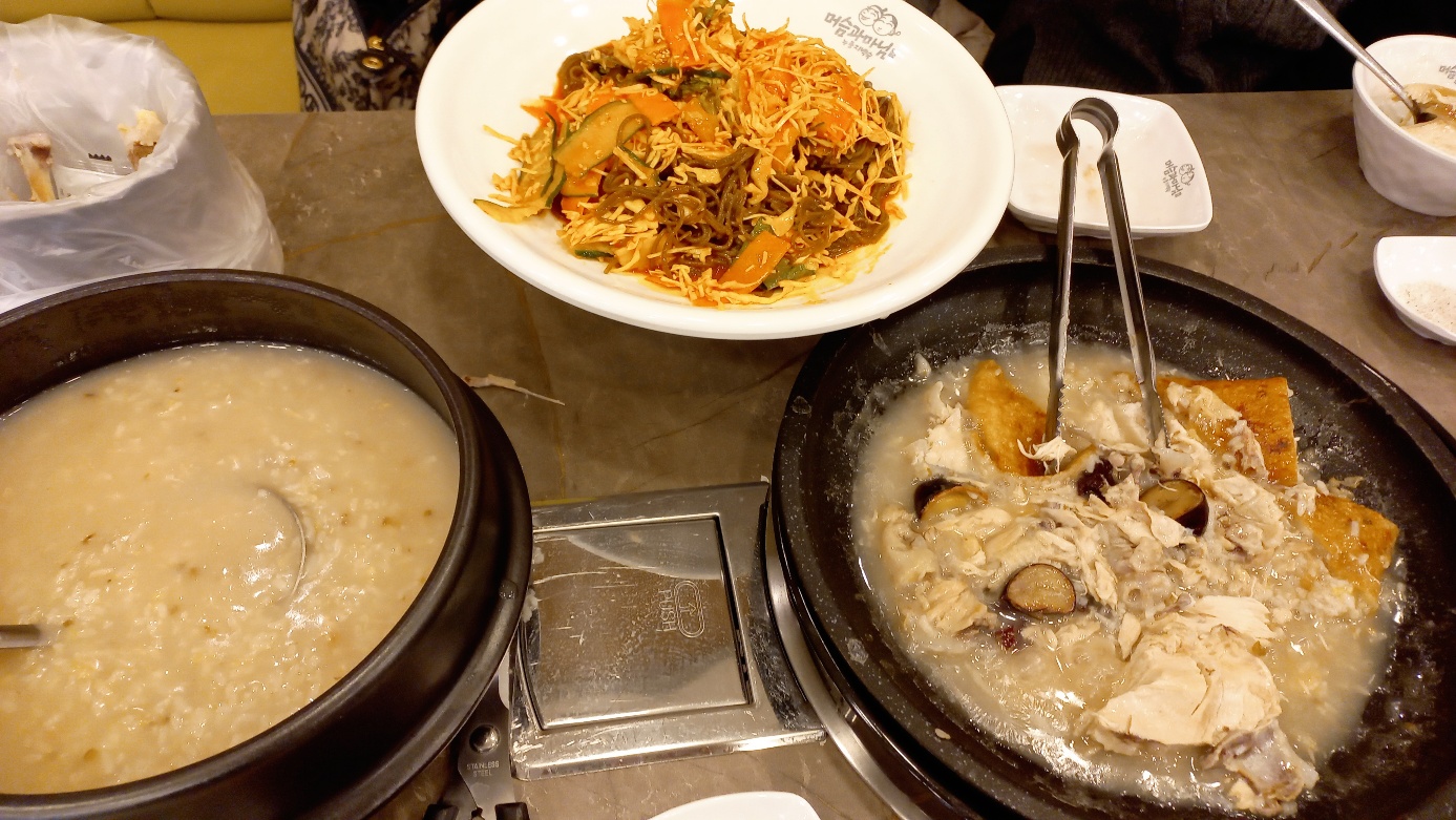 소화를 잘 못 시키는 일행이 있어서 항상 식사 메뉴를 정할때는 그 분을 배려하여 메뉴를 정한다. 이번 식사 모임은 홍제동 '머슴과 마님'에서 누룽지 백숙 세트를 2세트 시켰다. 세트당 3명이 먹기에는 약간 넉넉한 양이고 4인 가족이 먹기에는 약간 빠듯하다 싶은 정도의 양이다. 먹기 나름이겠지만. 우리 팀은 여자 셋이서 누룽지 백숙 세트 하나를 해치웠다. 세트라서 죽과 쟁반 모밀국수가 나왔다. 슴슴하면서 담백한 백숙에 새콤달콤한 쟁반국수는 환상의 조합이었다. 쫄깃하면서 적당하게 노릇노릇한 누룽지도 맛이 있었다. 누룽지 백숙이 먹고 싶었던 차에 좋은 점심 식사였다. 많이 먹어서 배가 부르지만 속이 불편하거나 거북하지 않다. 이게 백숙의 묘미인거 같다.